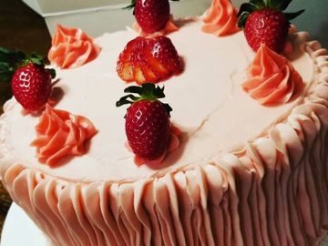 Fresh strawberry cake, with strawberry buttercream, topped with fresh strawberries.